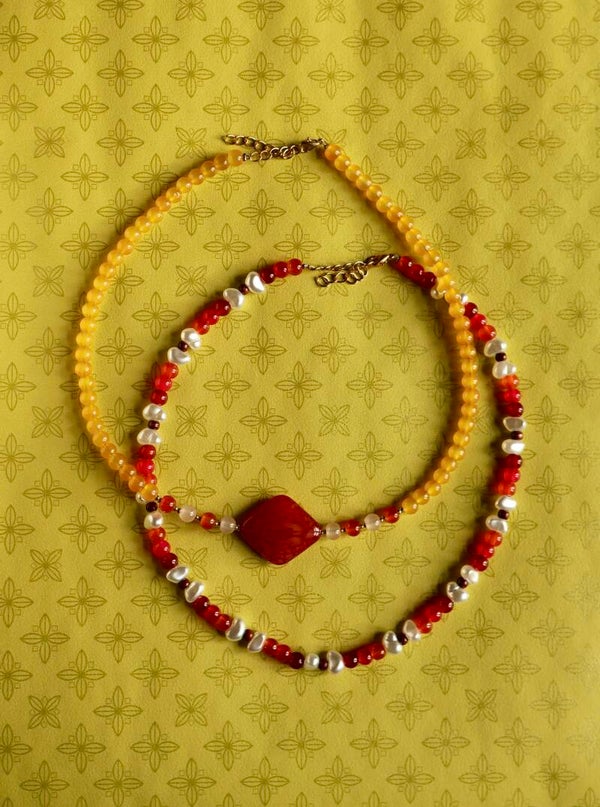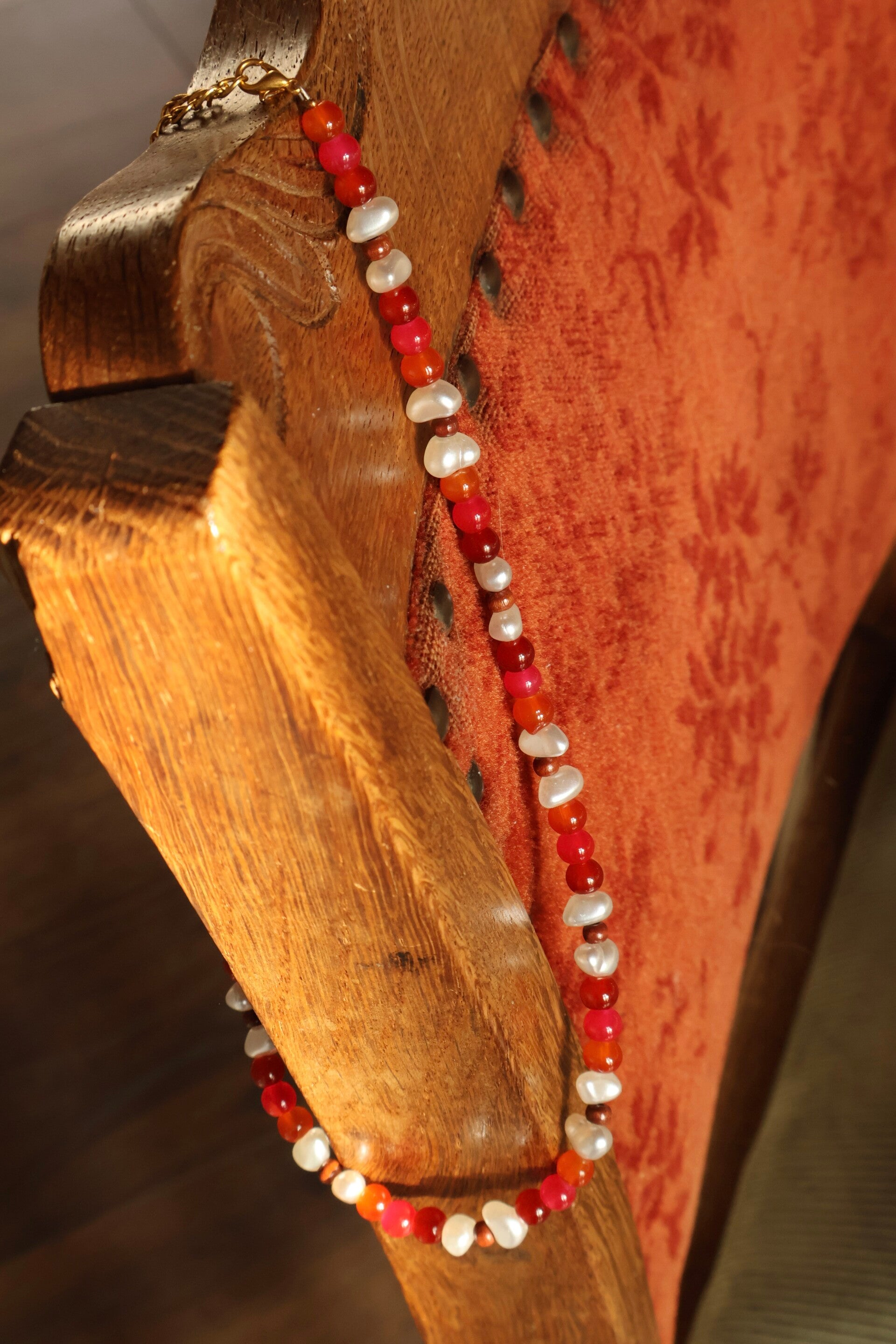 Deze handgemaakte ketting is uniek in zijn soort. Hij valt als een kort model mooi om te hals en is daardoor goed te combineren met andere sieraden.