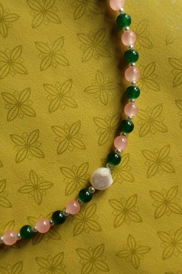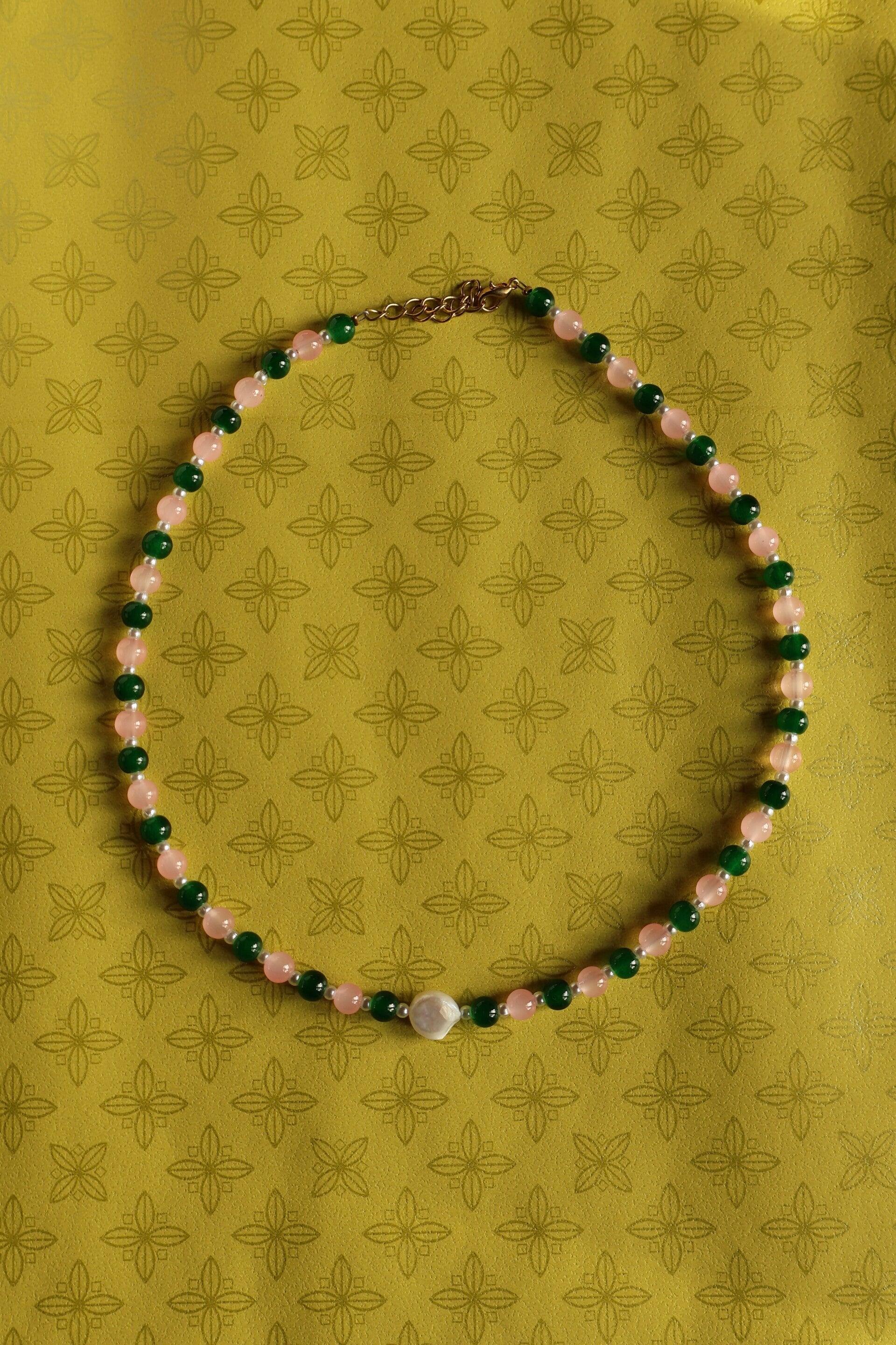 Deze handgemaakte ketting is uniek in zijn soort. Hij valt als een kort model mooi om te hals en is daardoor goed te combineren met andere sieraden.