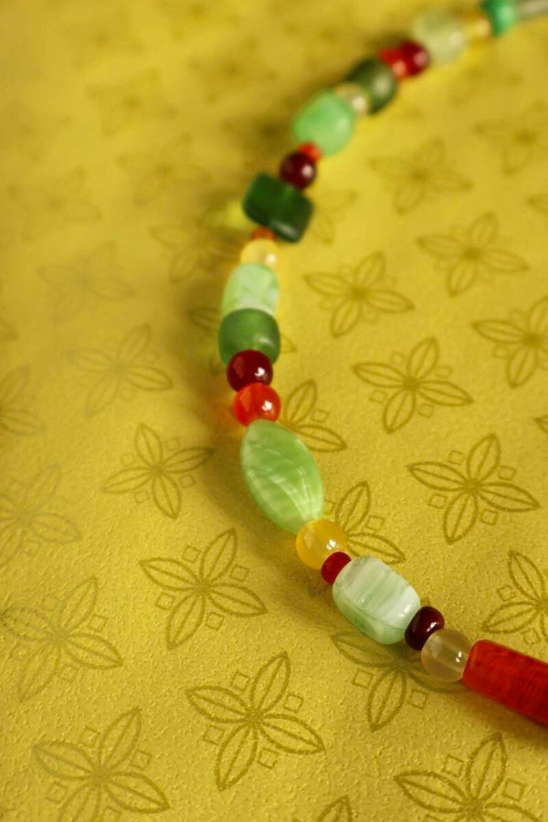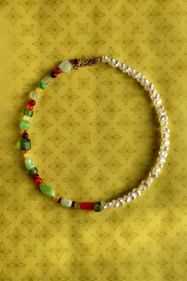 Deze handgemaakte ketting is uniek in zijn soort. Hij valt als een kort model mooi om te hals en is daardoor goed te combineren met andere sieraden.
