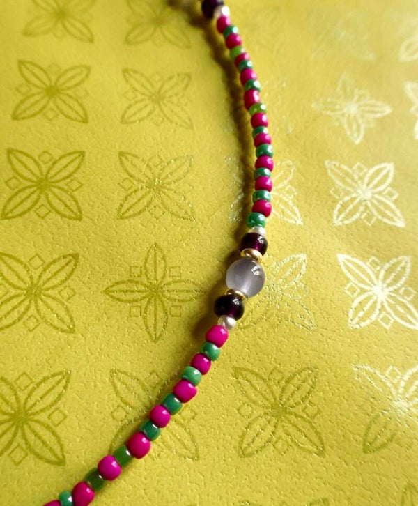 Deze handgemaakte ketting is uniek in zijn soort. Hij valt als een kort model mooi om te hals en is daardoor goed te combineren met andere sieraden.
